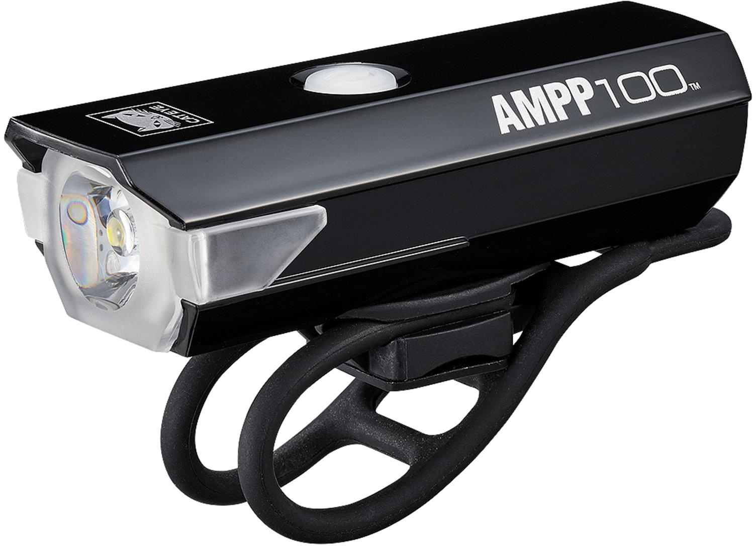 CatEye: A compact, lightweight and great-value 100 lumen front light with USB rechargeability and improved side visibility.The all-new AMPP100 is a powerful, easy-to-use front light, ideal for commuting, urban riding, or as a backup for longer journeys. It features a redesigned body with enhanced side visibility over the Volt 100, helping you see and be seen more clearly in traffic. Its improved 360° rotating strap mount allows flexible positioning on your bike, and its simple modes make it a no-fuss choice for everyday use.Now with a 5 year warranty!Features100 lumen outputImproved side visibility over previous modelsUSB rechargeableCompact and lightweight designNew 360° rotating rubber strap mountSimple, intuitive modesIdeal as a daytime safety light or backup light SPECIFICATIONSOutput: 100 lumens Battery: USB rechargeable Li-ion Mount: 360° adjustable rubber strap Modes: High, Low, Flash Run time: Up to 35 hours (Flash mode) Weight: Approx. 62g Dimensions: 75 x 28 x 40 mmTECHNOLOGIESOptiCube™ lens technology: Maximises brightness through proprietary lens design for enhanced visibility. Side visibility: Ensures you're seen from multiple angles to boost safety. USB rechargeable: Recharges from any standard USB port for convenience. Low battery indicator: Alerts you when it's time to recharge. Daytime use: Bright enough to be seen even in daylight conditions. All-weather (IPX4): Rain-resistant for reliable performance in wet conditions. 360° adjustable mount: Light can rotate fully for flexible positioning.