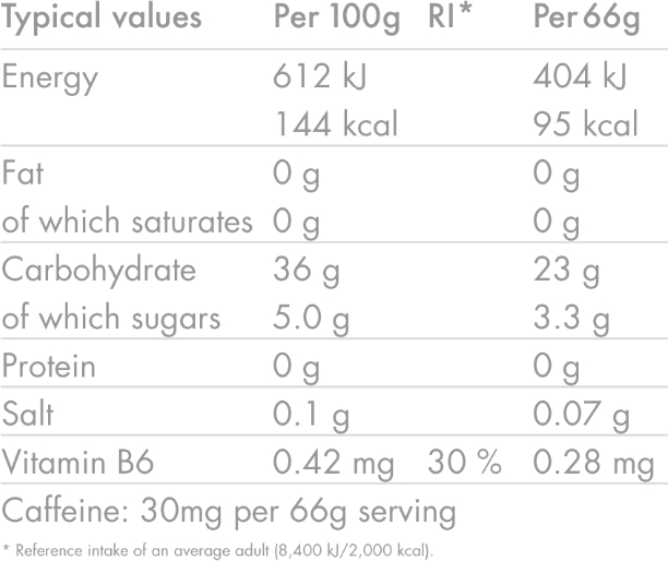 Contains caffeine. Not recommended for children or pregnant women. (45mg/100g).