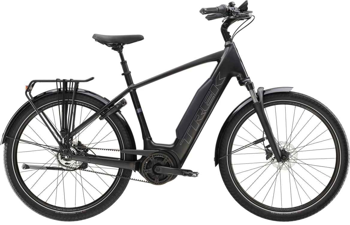 The 2023 District+ 4 400Wh is a standout e-bike from TREK designed to deliver exceptional performance, comfort, and convenience in both city and off-road environments. It boasts a rugged yet elegant hydroformed aluminium frame with an integrated Bosch PowerPack, offering multiple battery capacity options for tailored commuting experiences. With a low-maintenance Gates CDX belt drive and Nexus C7000 5-speed internally geared hub, you'll experience seamlessly smooth shifts, while the innovative Bosch Performance Line Smart System drive unit (250 Wh, 75 Nm) offers unbeatable power and speed. The easy-to-use Intuvia remote display not only allows for easy control, but also connects effortlessly with your smartphone for tracked activities, mapped rides, and more. Plus, the convenient built-in racks and lights add practicality to each journey. The District+ 4 is the perfect choice for the discerning commuter who requires a robust yet stylish e-bike. Its powerful Bosch motor and power pack provide reliable assistance for all your city rides or weekend trail adventures. Moreover, with added accessories such as mudguards and lights powered by the bike's battery, the District+ 4 serves as a comprehensive package for any ride. Stay one step ahead with the eBike Flow app – fully integrated with the Bosch Smart System, it equips you with a complete digital control centre for your e-bike, consolidating display, drive unit, controller, and eBike ABS into one accessible interface. Curious about the range? Visit Bosch's range calculator to see just how far you can ride your e-bike on a single charge. You can tweak the variables to get the most accurate estimate for your specific needs. Overall, the 2023 District+ 4- 400Wh is a testament to TREK's commitment to innovative design and impeccable performance, providing you with a seamless, enjoyable, and efficient ride.