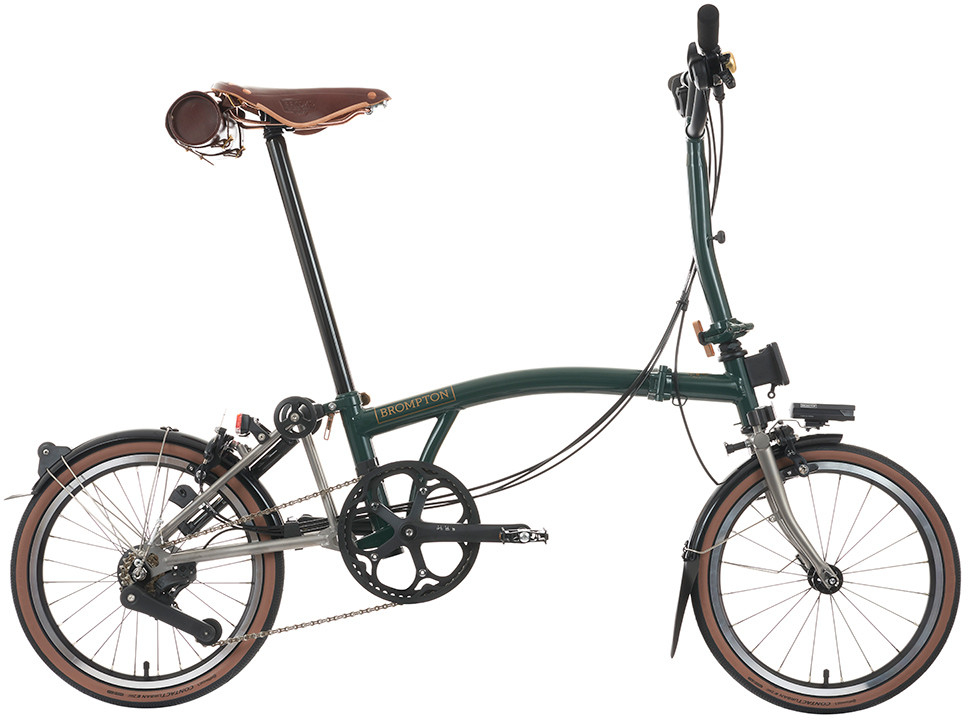 Putting the P in perfectly portable, the lightweight Brompton P Line is an expertly engineered folding bike for moving in the city and beyond. Built to last from tig-welded titanium and hand-brazed steel. The main frame is finished in a special edition shade of Brunswick Green, complemented by beautiful brass and rose gold accents, highlighting the finer points of the bike and a subtle nod to the inner workings and hand-finished elements of the accompanying makers series items.