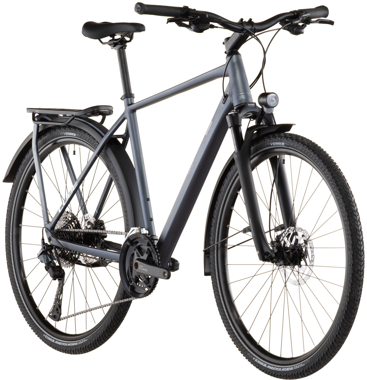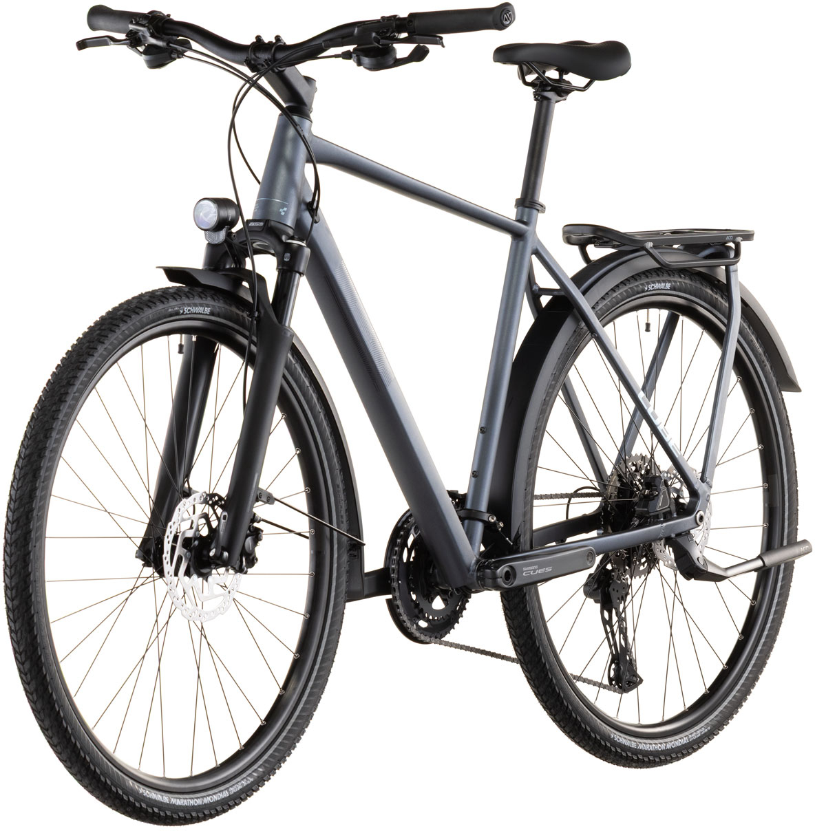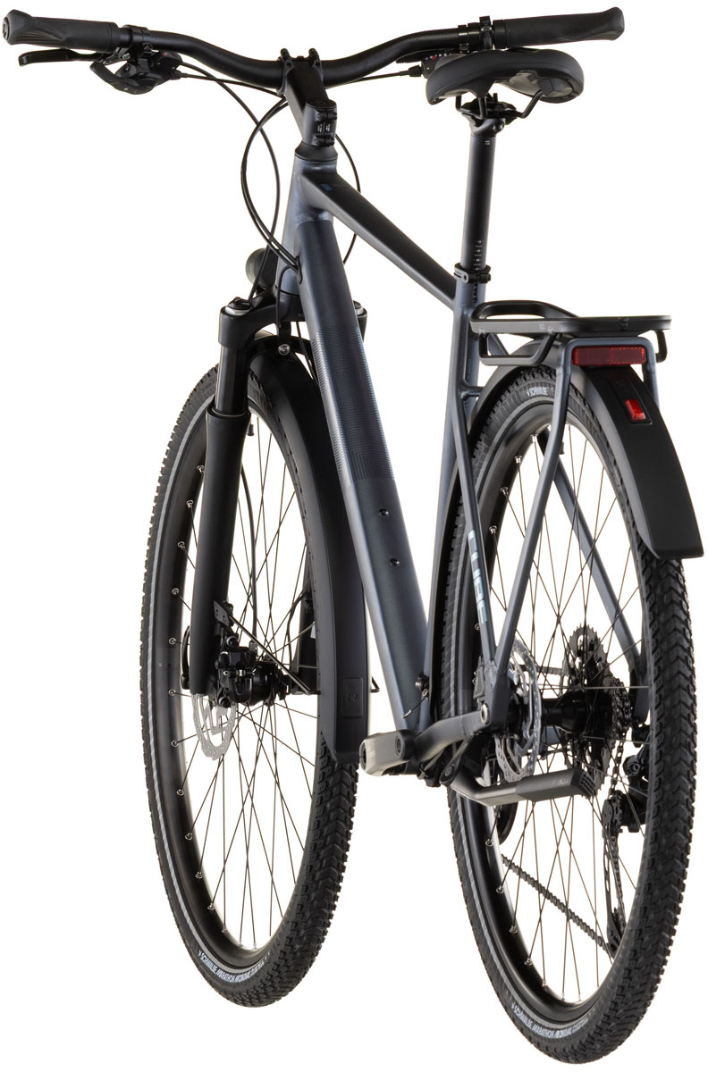 From zipping across town to tackling mountain passes you've never ridden before, the Kathmandu EXC from CUBE is designed to get you there - and back - in comfort and style. We chose Shimano's Cues 2x11 gears for their ease of use and reliability. Then we added powerful Shimano hydraulic disc brakes and Schwalbe's 47mm Marathon Mondial tyres, so you know you're in full control at all times. Finally, we selected an easily adjustable Suntour air suspension fork to take the edge off rough road surfaces. With our Integrated Carrier 3.0 and a full complement of accessories - including mudguards, kickstand and lights - you've everything you need. Just jump on and go.