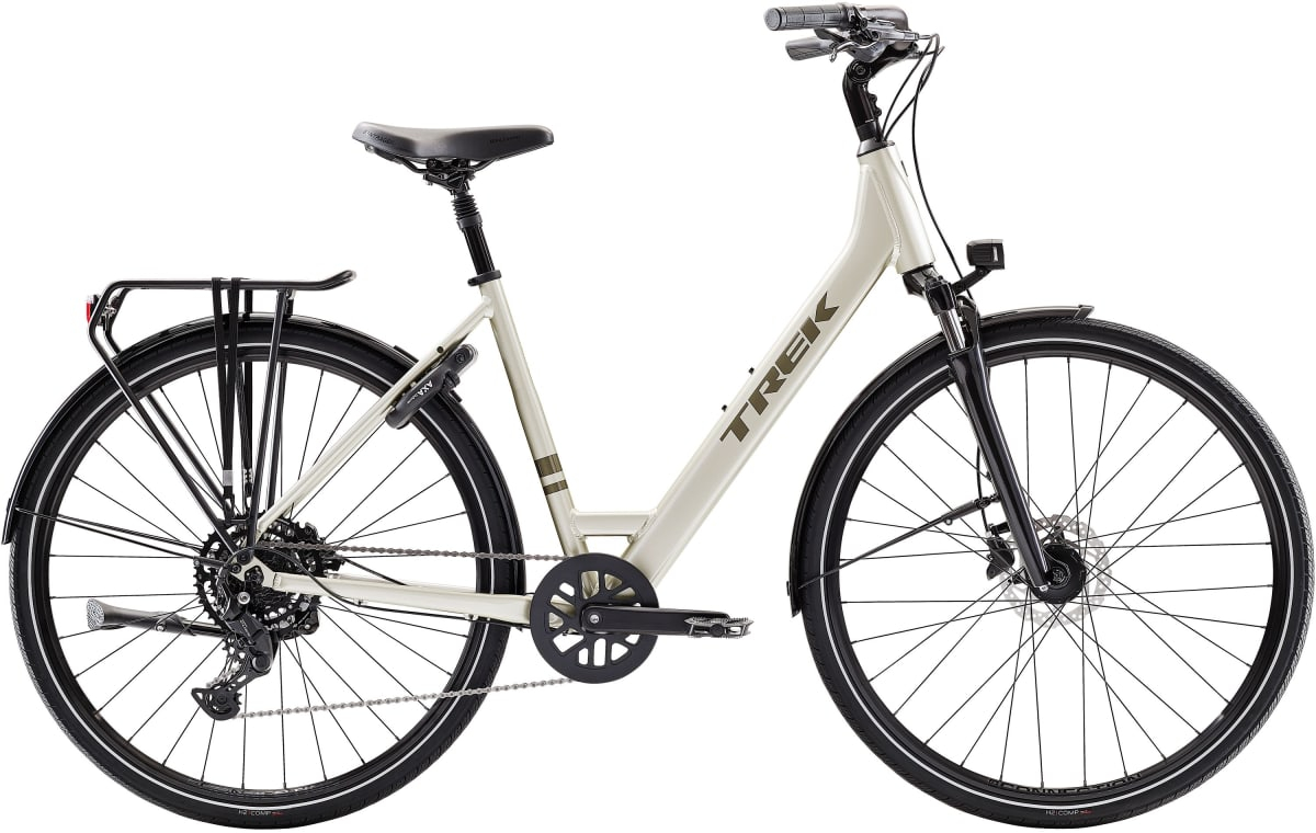 A lightweight aluminium frame with a lowstep design, a 9-speed Shimano CUES U4000 drivetrain for durable shifting, powerful hydraulic disc brakes, an adjustable stem, a padded saddle, ergonomic grips, reflective and wide 40c tes for extra stability, a road-smoothing suspension fork and seat post, front and rear lights powered by a 3.0-watt Dynamo hub and geometry that keeps you in a comfortable and upright riding posture. Plus, it comes equipped with everything you need to ride, like mudguards, lights, a kickstand, a lock and a rear MIK rack.