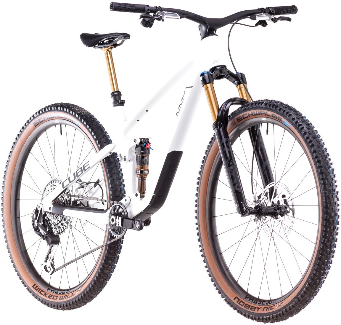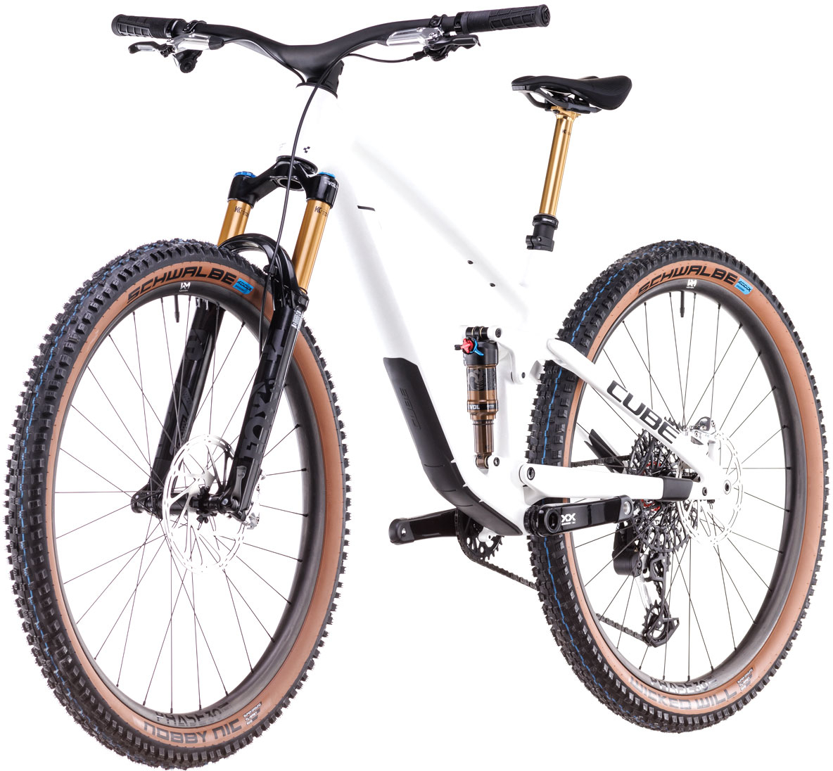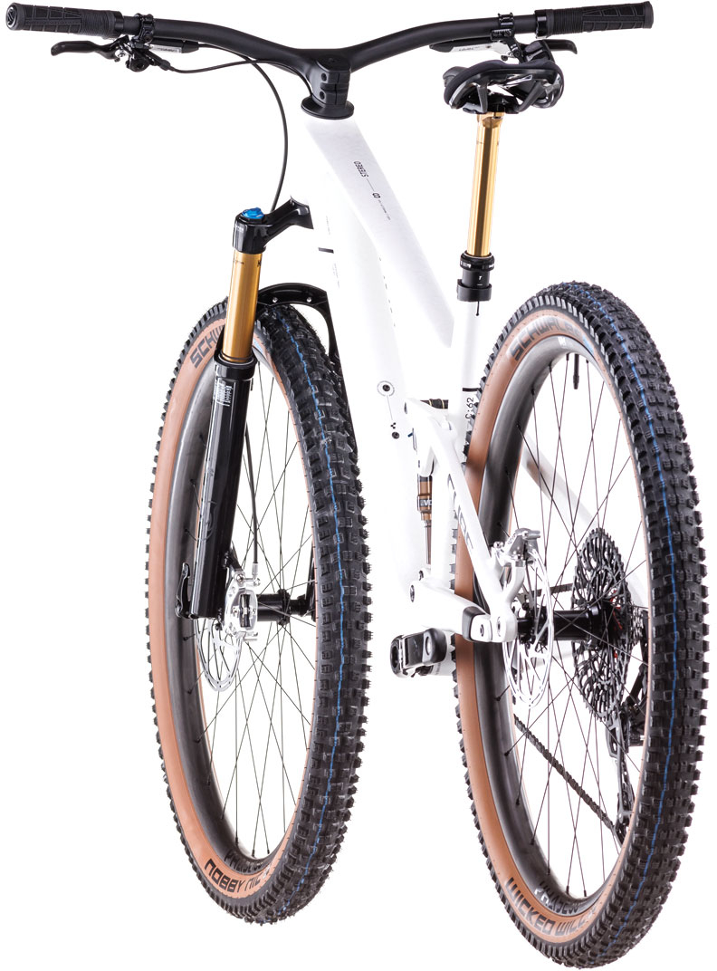 Light, lively, versatile and with added comfort - that's the Stereo ONE22 C:62 SLT in a nutshell. We started with Sram's XX Eagle Transmission, because it offers a huge gear range with electronic precision whilst setting a new standard for ruggedness and reliability. You'll be glad of the power of the matching Sram Level Ultimate 4-piston hydraulic disc brakes because, with a 130mm Fox 34 Float Factory GripX fork up front and matching Float Factory shock at the rear, the corners will be coming up fast. Lightweight Newmen Phase 30 wheels and Schwalbe Nobby Nic and Wicked Will 2.4in tyres with Aerothan tubes help keep the rubber side down, and a one-piece carbon bar/stem combo puts you in full control.