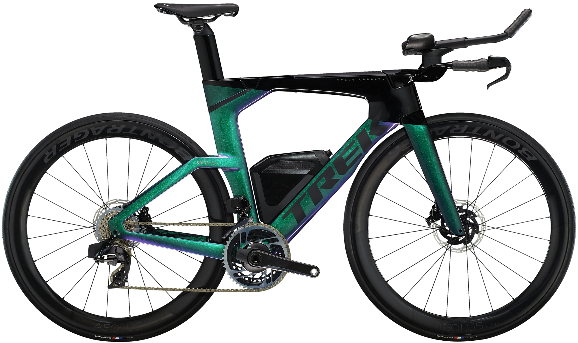 Ultra-lightweight 800 Series OCLV Carbon frame, drag-reducing Kammtail Virtual Foil (KVF) tube shaping, Speed Concept full foil carbon fork, road-smoothing IsoSpeed, integrated fuel storage, hydration and flat kit storage, SRAM RED AXS wireless electronic 12-speed drivetrain with SRAM AXS Blips shifters, a RED AXS power meter, fully integrated handlebar and stem, Bontrager Hilo Pro Carbon triathlon-specific saddle for an aggressive aero position, disc brakes for reliable stopping power and aero Bontrager Aeolus RSL 51 OCLV Carbon wheels.